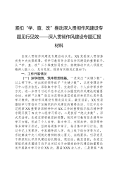 紧扣“学、查、改”推动深入贯彻作风建设专题见行见效——深入贯彻作风建设专题汇报材料自深入贯彻作风建设专题启动以来,XX党委深入贯彻落实党中央决策部署,将学习教育作为深化作风建设的重要抓手,从“学、查、改”三个维度协同发力,持续推动中央八项规定精神入脑入心、见行见效。现将有关情况汇报如下:一、工作开展情况(一)深学细悟,筑牢思想根基。一是突出“关键少数”,以上带下学。突出抓好领导班子“关键少数”,以党委理论学习中心组为依托,采取集中学习、交流研讨、个人自学等多种方式,进一步学习习近平总书记关于加强党的作风建设的重要论述,发挥“头雁”效应示范带动基层党组织和党员认真开展学习教育,推动作风建设专题走...