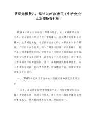 县局党组书记、局长2025年度民主生活会个人对照检查材料根据本次民主生活会统一部署和要求,本人紧紧围绕会议主题,在会前深入学习了关于党的建设、作风建设的重要论述精神,认真研读党的二十届四中全会文件,并积极参加学习研讨,广泛征求各方意见,深入开展谈心谈话。在此基础上,我严格对照党章党规党纪,对照中央八项规定及其实施细则精神,对照初心使命与岗位职责,紧密结合个人思想动态、学习情况、工作实践和作风建设实际,进行了深刻的自我检视和反思,深入查摆存在问题,剖析思想根源,明确整改方向。现将对照检查情况汇报如下:一、2025年度学习贯彻中央八项规定精神情况统想认识一年来,我始终坚持把贯彻落实中央八项规定精神...