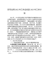 区司法局2022年工作总结及2023年工作计划2022年,XX区司法局以习近平新时代中国特色社会主义思想为指导,全面贯彻党的十九大和十九届历次全会精神,在区委区政府的坚强领导下,聚焦创建第二批“全国法治政府建设示范区”目标,踔厉奋发,笃行不怠,扎实履行司法行政工作职能,为XX区“引领高质量发展,建设现代化新城”战略提供坚强的法治保障。2022年,XX区作为全省唯一的区县通过了第二批“全国法治政府建设示范区”的公示,芷兰街道柳菱社区被命名为第九批“全国民主法治示范村(社区)”,邓盈盈被湖南省司法厅、湖南省人社厅授予“湖南省司法行政工作先进个人”称号,府坪街道东湖巷社区被命名为第十批“湖南省民主法...