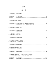 (15篇)市委办公室班子成员述职报告、部门负责人述职报告(办公室个人工作总结)目 录1.市委办副主任张云峰:2023年个人述职报告 12.市委办副主任丁燕军:2023年个人述职报告:向梦想更深处奋进 43.市委办副主任邓广团:2023年个人述职报告 74.市委办副主任徐芳:2023年个人述职报告 95.市专用通信局局长吴苏贤:2023年个人述职报告 126.市委办秘书科科长徐祯:2023年个人述职报告 147.市委办信息室主任、一级主任科员罗招荣:2023年个人述职报告 168.市委办调研科科长李俊鹏:2023年个人述职报告 189.市委办综合二科科长李刚:2023年个人述职报...