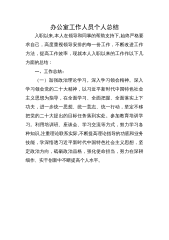 办公室工作人员个人总结入职以来,本人在领导和同事的帮助支持下,始终严格要求自己,高度重视领导安排的每一份工作,不断改进工作方法,提高工作效率,现就本人入职以来的工作作以下几方面的总结:一、工作总结:(一)加强政治理论学习。深入学习领会精神。深入学习领会党的二十大精神,以习近平新时代中国特色社会主义思想为指导,在全面学习、全面把握、全面落实上下功夫,进一步统一思想、统一意志、统一行动,坚定不移把党的二十大提出的目标任务落到实处。参加教育培训学习。利用培训班、座谈会、学习交流等方式,努力学习各种知识,注重理论联系实际,不断提高理论指导的功底和业务技能,学深悟透习近平新时代中国特色社会主义思想,坚定...