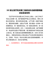 XX省公安厅机关第二批政法队伍教育整顿座谈会发言材料习近平总书记在全国公安工作会议上指出,公安工作处于司法公正的第一线,能不能做到严格公正文明执法,事关人民群众切身利益,事关党和政府形象从严治警一刻都不能放松,要坚持政治建警、全面从严治警、着力锻造一支有铁一般的理想信念、铁一般的责任担当、铁一般的过硬本领、铁一般的纪律作风的公安铁军。近日,X总队按照公安部、省党委要求,突出抓好全面从严管党治警,着力锻造忠诚干净担当过硬公安队伍第二批政法队伍教育整顿部署以来,在深入学习的基础上,我更加深刻地认识到全面从严治党治警对锻造革命化、正规化、专业化、职业化过硬公安队伍的极端重要性,并有几点粗浅的认识,在...