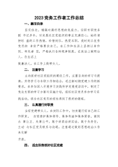 2023党务工作者工作总结一、廉洁自律坚定信念,增强对腐朽思想的免疫力。任职专职党务副书记多年,对发展社区党组织的事业充满信心,始终保持旺盛的工作热情,珍惜岗位,热爱本职,我时刻以优秀党员的身份严格要求自己,在工作和生活上坚持以身作则、率先垂范,严格执行各种规章制度,在政治上做明白人,在生活上做廉洁人,在工作上做带头人。二、注重学习主动抓好社区党组织的建设工作,注重自身的学习与提高,并将学习与本职工作相结合,适应新时期党建工作的新要求,在参加深入开展学习实践科学发展观活动中,制定了党总支部的学习方案与实施计划,组织社区党员参加学习实践活动,使全社区党员的党性得到了很好的锻炼。三、认真履行好职责...