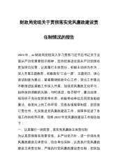 财政局党组关于贯彻落实党风廉政建设责任制情况的报告2023年,xx财政局党组深入学习贯彻习近平总书记关于全面从严治党重要指示精神,坚持把推进全面从严治党摆在更加突出位置,认真履行主体责任,积极主动担当作为,深入开展主题教育,积极落实“三会一课”、主题党日、谈心谈话制度为重点,紧紧围绕财政中心工作,突出工作重点不断推进反腐败工作深入开展。加强党风廉政文化学习,始终保持清醒的头脑,与时俱进,恪尽职守,廉洁自律,领导班子充分发挥表率作用,积极带动单位共同营造勤政廉洁、奋发向上的工作环境,完善各项规章制度,层层签订责任书,扎实推进党风廉政建设工作,保障和促进了各项工作的有序开展。现将2023年党风廉政...