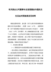 国企公司领导干部2022年度民主生活会“六个带头”对照检查材料按照中央和省市部署要求,我紧紧围绕这次专题民主生活会的主题,在前期系统领会习近平新时代中国特色社会主义思想的基础上,又深入学习了XX精神、党章、习近平总书记在xx上的重要讲话以及规定篇目,进一步提升政治站位、牢固理论根基。同时,采取座谈交流、走访调研、谈心交心等方式,广泛征求意见建议,认真对照带头深刻感悟“两个确立”的决定性意义等六个方面,紧密联系个人思想和工作实际,深入查摆问题、剖析原因症结,制定整改措施。现将对照检查情况汇报如下: 一、存在的主要问题 (一)在带头深刻感悟“两个确立”的决定性意义,增强“四个意识”、坚定“四个...