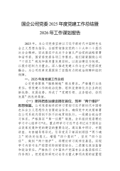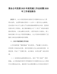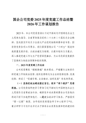 国企公司党委2025年度党建工作总结暨2026年工作谋划报告2025年,本公司党委坚持以新时代中国特色社会主义思想为指导,全面贯彻落实党的二十大和二十届历次全会精神,坚决落实中央关于全面从严治党的战略部署和省市委、国资委党委各项工作要求。我们紧紧围绕公司“十四五”规划和高质量发展目标,以政治建设为统领,以提升组织力为重点,深入推进党建工作与生产经营深度融合,为公司改革发展提供了坚强有力的政治保障和组织保障。一、2025年度党建工作总结公司党委聚焦“强根铸魂”根本要求,严格履行主体责任,将党建工作的政治优势、组织优势转化为企业的创新优势、发展优势,形成了“党建引领、业务驱动、协同发展”的良好局面...