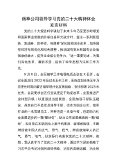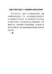 县委办机关党员领导干部学习党的二十大报告精神心得研讨发言材料10月16日上午,党的二十大开幕会胜利召开。在集中收看开幕式实况后,下午,办公室就组织召开理论学习中心组集体学习讨论会议,第一时间传达学习习近平同志在中国共产党第二十次全国代表大会上的报告精神,并开展集中讨论,研究部署学习宣传贯彻措施,充分体现了县委办作为党委“第一机关”的政治敏锐性和雷厉风行抓落实的扎实作风。 一是要深刻领会丰富精神内涵,在学思践悟中汲取奋进力量。党的二十大主题鲜明,提出了高举中国特色社会主义伟大旗帜,全面贯彻新时代中国特色社会主义思想,弘扬伟大建党精神,为全面建设社会主义现代化国家、全面推进中华民族伟大复兴而团结...