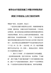 领导在全市基层党建工作暨共同缔造美好家园工作推进会上的汇报发言材料尊敬的**部长,各位领导,同志们: **县坚持以党建引领基层社会治理,积极探索构建“纵向到底、横向到边、共建共治共享”的组织体系、工作体系、治理体系,着力把党的政治优势组织优势和制度优势转化为基层治理效能,努力让人民群众获得感成色更足、幸福感更可持续、安全感更有保障。****年,**县在湖北市县域经济高质量发展综合评价中首次进入全市第三类县市区前十,在全市群众安全感调查测评中“安全感”指标位列全市***个县(市、区)第一,在全市县(市、区)域文明指数测评中位列全市县(市)类第一。根据会议安排,现将有关工作进展情况汇报如下: ...