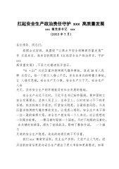 扛起安全生产政治责任守护xxx高质量发展xxx镇党委书记xxx(2023年7月)各位领导、同志们:按照会议安排,我围绕“以高水平安全保障高质量发展”作交流发言,我发言的题目是《扛起安全生产政治责任,守护xxx高质量发展》,不妥之处敬请批评指正。“6·21”兴庆区富洋烧烤燃气爆炸事故,造成38名人民群众伤亡,每一个银川人痛心不已,发生在身边的特重大事故,让人痛定思痛,安全生产无小事,安全生产大于天,安全生产人命关天,没有安全生产的环境就没有社会发展的基础。安全生产永远不过时,习近平总书记始终强调,要牢固树立安全发展理念,坚持人民至上、生命至上,以时时放心不下的责任感,抓实抓细工作落实,盯紧苗头隐...