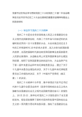 党委书记在传达学习贯彻党的二十大和党的二十届一中全会精神及习近平总书记在二十大会议期间的重要讲话精神专题会上的发言材料(一)传达学习党的二十大精神党的二十大是在全党全国各族人民迈上全面建设社会主义现代化国家新征程、向第二个百年奋斗目标进军的关键时刻召开的一次十分重要的大会。大会全面总结过去5年的工作和新时代10年的伟大变革,深入分析当前国际国内形势,全面把握新时代新征程党和国家事业发展新要求、人民群众新期待,从战略全局上对党和国家事业作出规划和部署,指明了党和国家事业的前进方向。大会选举产生了新一届中央委员会和中央纪律检查委员会,通过了关于十九届中央委员会报告的决议、关于十九届中央纪律检查委员...
