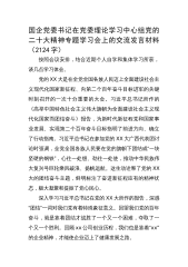 国企党委书记在党委理论学习中心组党的二十大精神专题学习会上的交流发言材料按照会议安排,结合近期个人自学和集体学习所获,谈几点学习体会。党的XX大是在全党全国各族人民迈上全面建设社会主义现代化国家新征程、向第二个百年奋斗目标进军的关键时刻召开的一次十分重要的大会。习近平总书记所作的《高举中国特色社会主义伟大旗帜为全面建设社会主义现代化国家而团结奋斗》报告,为新时代新征程党和国家事业发展、实现第二个百年奋斗目标指明了前进方向、确立了行动指南。习近平总书记在参加党的XX大广西代表团讨论时强调,全党全国各族人民要在党的旗帜下团结成“一块坚硬的钢铁”,心往一处想、劲往一处使,推动中华民族伟大复兴号巨轮乘...