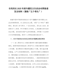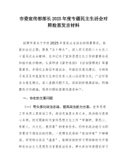 区委常委、区委宣传部长2025年度民主生活会个人对照检查发言材料(五个带头)根据区委关于召开2025年度民主生活会的统一部署,我紧扣会议主题,通过集中学习、专题研讨、基层走访、谈心谈话等方式,深入学习党的二十大及历次全会精神、习近平新时代中国特色社会主义思想特别是习近平文化思想,广泛征求各方意见建议。对照“五个带头”要求,结合自身思想、岗位职责和工作实际,进行深刻自我剖析,现将对照检查情况汇报如下:一、存在的主要问题(一)带头强化政治忠诚,提高政治能力方面。一是政治判断力不够敏锐。宣传思想工作本质上是政治工作,但在实际推进中,有时存在“就业务抓业务”的惯性思维,对一些文化活动、宣传载体背后蕴含...