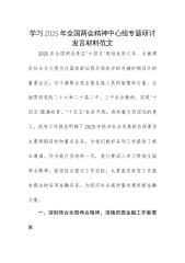 市人社局党组书记在理论学习中心组学习2025年全国两会精神研讨发言材料尊敬的各位领导,同志们:全国两会是在全面贯彻落实党的二十大和二十届二中、三中全会精神,全面建设社会主义现代化国家、向第二个百年奋斗目标进军的关键时刻召开的一次十分重要的会议。大会审议通过的政府工作报告和其他重要报告、《中华人民共和国立法法(修正草案)》、《国务院机构改革方案》,选举产生新一届国家机构和全国政协领导人,顺利实现国家机构和政协机构组成人员的新老交替,对于全面建设社会主义现代化国家、全面推进中华民族伟大复兴具有十分重大的意义。特别是总书记全票当选国家主席、中央军委主席,充分反映了全党全军全国各族人民的共同心愿,充分...