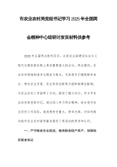 市农业农村局党组书记学习2025年全国两会精神中心组研讨发言材料供参考2025年全国两会胜利召开,这是在全面建设社会主义现代化国家新征程上具有重要意义的会议。两会期间,农业农村领域的诸多议题成为焦点,代表委员们围绕粮食安全、特色农业发展、农业科技创新等方面积极建言献策,为农业农村工作指明了方向,提供了强大动力。作为市农业农村局党组书记,通过深入学习两会精神,结合我市农业农村工作实际,我深感责任重大,使命光荣,对如何推动我市农业农村高质量发展有了更深刻的思考和认识。一、严守粮食安全底线,确保粮食稳产高产,保障地区粮食供应粮食安全是"国之大者",是国家安全的重要基础。全国两会对粮食安全的强调,让我...