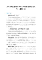 2024年抓党建促乡村振兴工作会上的讲话及发言材料【八篇】汇编供参考2024年抓党建促乡村振兴工作会上的讲话及发言材料一同志们:这次会议的任务是深入学习贯彻习近平总书记关于乡村治理工作的重要论述和指示批示精神,全面落实中央农村工作会议和中央一号文件精神,部署我市抓党建提升乡村治理现代化水平重点任务。乡村治理是国家治理的重要组成部分,能否实现乡村治理现代化,关系着国家治理现代化全局。党管农村工作是中国共产党的优良传统,农村基层党组织是党在农村的坚强战斗堡垒。新征程上,必须把坚持党管农村工作要求贯穿乡村治理全过程,充分发挥农村基层党组织在培育优质人才、塑造文明乡风等方面的引领作用,确保乡村振兴战略...