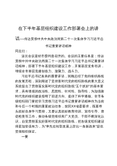 在下半年基层组织建设工作部署会上的讲话---传达贯彻中共中央政治局第二十一次集体学习习近平总书记重要讲话精神同志们:这次会议是经市委同意召开的。会议的主要任务是:传达贯彻中共中央政治局第二十一次集体学习习近平总书记重要讲话精神,部署下半年基层组织建设工作,开展基层党务培训,增强全市基层党建创造力、凝聚力、战斗力。习近平总书记发表的重要讲话,回顾总结了党的组织路线的发展历程,深刻阐述了坚持新时代党的组织路线的重大意义系统提出了贯彻落实新时代党的组织路线“五个抓好”的基本要求,具有很强的政治性、思想性、针对性、指导性,为加强新时代党的组织建设指明了前进方向、提供了科学遵循。全市各级组织部门要把学习...