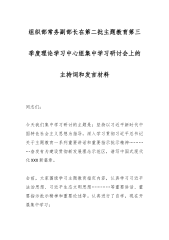 组织部常务副部长在第二批主题教育第三季度理论学习中心组集中学习研讨会上的主持词和发言材料同志们:今天我们集中学习研讨的主题是:坚持以习近平新时代中国特色社会主义思想为指导,深入学习贯彻习近平总书记关于主题教育一系列重要讲话和重要指示批示精神…………奋发有为建设贯彻新发展理念示范区,谱写中国式现代化XXX新篇章。会前,大家围绕学习主题教育指定内容,认真学习习近平法治思想、习近平生态文明思想…………等重要讲话、重要指示批示精神和重要论述等。认真进行了自学,现在开展集中学习:首先,由我领学习近平总书记在…………的重讲话精神;下面,由XX同志领学XX同志…………的重讲话精神;请XX同志领学XX同志在主...