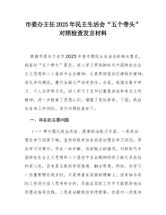 市委办主任2026年民主生活会“五个带头”对照检查发言材料根据市委关于召开2025年度专题民主生活会的相关要求,我紧扣“五个带头”要求,深入学习贯彻习近平新时代中国特色社会主义思想和二十届四中全会精神,认真贯彻落实纪律规定精神,深化作风建设,履行全面从严治党责任。会前,我通过集中学习、个人自学等方式,深入学习了习近平总书记重要讲话和有关文件精神,进一步提高了思想认识,增强了党性修养。下面,我结合自身工作实际,进行对照检查如下。一、存在的主要问题(一)带头强化政治忠诚、提高政治能力方面。一是政治理论学习深度不够。虽然积极参加各类政治理论学习活动,但在学习过程中,存在一知半解、浅尝辄止的情况。对习...