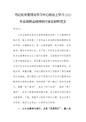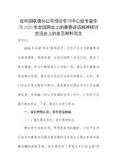在中国联通分公司理论学习中心组专题学习2025年全国两会上的重要讲话精神研讨交流会上的发言材料范文同志们:2025年全国"两会"胜利召开,习近平总书记的重要讲话高屋建瓴、思想深邃,为我们指明了前进方向、提供了根本遵循。作为中国联通分公司的一员,我们肩负着推动通信事业发展、服务地方经济社会进步的重任。此刻,我们在此开展专题学习研讨,就是要深刻领会总书记讲话精神实质,将其融入到公司发展的各项工作中,以实际行动践行使命担当。下面,我谈几点学习体会。一、深化思想认识,筑牢政治根基(一)强化理论武装,坚定理想信念理论是行动的先导,思想是前进的旗帜。习近平总书记的系列重要讲话蕴含着深厚的马克思主义理论素养...