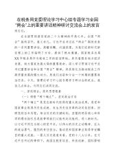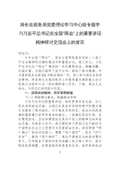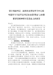 审计局副书记、副局长在理论学习中心组专题学习习近平总书记在全国“两会”上的重要讲话精神研讨交流会上的发言同志们:在全面贯彻落实党的二十届三中全会精神的开局之年,全国“两会”胜利召开,意义非凡。习近平总书记在“两会”期间的一系列重要讲话,为我们指明了前行方向,提供了根本遵循。作为XX市审计局的一员,我们要深刻领会讲话精神,紧密结合审计工作职能,切实将思想和行动统一到党中央决策部署上来,充分发挥审计在保障经济社会高质量发展中的重要作用。下面,我谈几点体会,与大家共同交流探讨。一、深刻领会,筑牢思想根基思想是行动的先导,深刻领会习近平总书记在全国“两会”上的重要讲话精神,是我们做好各项工作的前提我们...