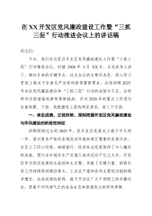 在XX开发区党风廉政建设工作暨“三抓三促”行动推进会议上的讲话稿同志们:今天,我们在这里召开全区党风廉政建设工作暨“三抓三促”行动推进会议,时值 2026年 3月 XX日,正处在承上启下、继往开来的关键节点。这次会议的主要任务是,深入学习贯彻上级关于全面从严治党的新部署新要求,总结回顾2025 年全区党风廉政建设和“三抓三促”行动的成效与不足,分析研判当前面临的新形势新挑战,并对2026年的重点工作进行全面部署。下面,我根据党工委的研究意见,讲三个方面。一、肯定成绩,正视形势,深刻把握开发区党风廉政建设与作风建设的阶段性特征回顾刚刚过去的2025年,是开发区发展史上极不平凡的一年。面对复杂严峻...