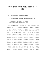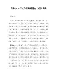在XX县2026年工作思路研讨会上的讲话稿(精品)同志们:今天,我们在这里召开全县2026年工作思路研讨会,主要任务是深入学习贯彻党的二十届四中全会和中央经济工作会议精神,全面对标落实省委、市委全会的最新部署要求,集思广益、凝聚共识,共同谋划明年乃至“十五五”时期的发展蓝图。刚才,县委、县政府的相关负责同志,以及各镇(区)、各部门的主要负责同志都作了很好的发言,大家准备充分、思考深入,谈思路、讲举措、定目标,在交流碰撞中统一了思想、明晰了路径,展现了干事创业、争先进位的良好精神风貌。2026年,是实施“十五五”规划的开局之年,也是我们向着更高发展目标迈进的关键之年。常言道,“五年看头年,开局是...