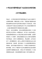 X书记在市委常委会扩大会议的主持讲话稿(关于两会精神)同志们,今天我们组织召开市委常委会扩大会议,专题学习全国两会精神。刚刚全国人大代表、市委党校*教授将全国两会精神结合自身与会经历跟大家进行了宣讲交流,对我们更好的学习领会会议精神起到了开山引路的重要作用(让我们用热烈掌声对*教授表示衷心感谢)。同志们,这次全国两会,是在全面贯彻落实党的二十大精神开局之年召开的一次重要会议,对于进一步动员全国人民更加紧密团结在以xxx同志为核心的党中央周围,全面贯彻党的二十大精神,实现全面建设社会主义现代化国家顺利开局起步,具有十分重要的意义。两会期间,总书记发表了一系列重要讲话,是对xxx新时代中国特色社会...