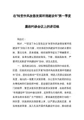 在“转变作风改善发展环境建设年”第一季度廉政约谈会议上的讲话稿 同志们: 刚才,**宣读了办公室党总支“转变作风改善发展环境建设年”活动工作方案,对全系统作风建设年活动的主要目标、重点任务、具体措施、组织保障等提出了明确要求,各科室、各单位要认真抓好落实。下面,我就高标准、严要求扎实推进“作风建设年”活动,讲五点意见。 一、提高政治站位,切实增强思想自觉和行动自觉。区委、区政府决定在全区开展“转变作风改善发展环境建设年”活动,是站位推动**区长远发展、增进人民群众福祉的高度,做出的一项重大决策部署。办公室作为政府的综合办事机构和行政指挥中枢,是连接区政府和各乡镇、各部门的纽带,要坚决落实...