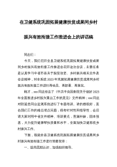 在卫健系统巩固拓展健康扶贫成果同乡村振兴有效衔接工作推进会上的讲话稿 同志们: 今天,我们召开全县卫健系统巩固拓展健康扶贫成果同乡村振兴有效衔接工作推进会召开这次会议,主要任务是认真学习中省市县关于脱贫攻坚、乡村振兴相关文件及会议精神,对全系统2023年巩固拓展健康扶贫成果同乡村振兴有效衔接工作进行再动员、再部署、再落实。 刚才,xxx同志传达了《中共中央国务院关于做好2023年全面推进乡村振兴重点工作的意见》文件精神;xxx同志对防返贫同台监测系统进行了专题培训。讲的都很好,直击我们工作的难点堵点问题,很有针对性和指导性,会后请大家对照中省文件精神、培训要点,查漏补缺,固本强基,大力提...