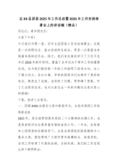 XX镇在全镇高质量发展暨年度工作部署会议上的讲话稿(精品)同志们:今天,我们在这里隆重召开全镇高质量发展暨年度工作部署会议,主要任务是全面回顾总结2025年的工作,深刻分析当前我们面临的新形势、新挑战,系统部署2026年全镇经济社会发展的各项目标任务,动员全镇上下进一步统一思想、凝聚共识、坚定信心、真抓实干,奋力开创XX镇高质量发展新局面。下面,我讲三点意见。一、肯定成绩,总结经验,在砥砺奋进中增强高质量发展的坚定信心刚刚过去的2025年,是全镇发展历程中极不平凡、充满考验的一年。面对复杂严峻的宏观经济形势和艰巨繁重的发展任务,全镇各级党组织、广大党员干部和人民群众一道,深入落实“深学争优、敢...