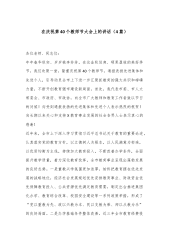 党委书记在庆祝第40个教师节暨表彰大会上的讲话:弘扬教育家精神,做新时代“大先生”尊敬的各位老师:下午好!当金秋的微风带来果实成熟的芬芳,我们相聚在一起,致敬平凡更致敬伟大。在第40个教师节即将来临之际,我谨代表学校向全体教职员工致以亲切问候和崇高敬意!向为教育奉献大半辈子,光荣退休的老师致以衷心感谢!向即将获得表彰的先进个人致以热烈祝贺!今天,我们在座的老师,有的从教刚好40年,有的迎来的是从教后第一个教师节。因为对教育事业的热爱,我们共同将教师节视为了人生岁月里最重要的时间节点,即便我们每天都在经历教育的日常,每天都在见证教育的力量,但惟有今天,教师这个称号所带来的荣光显得格外的闪耀。从自...