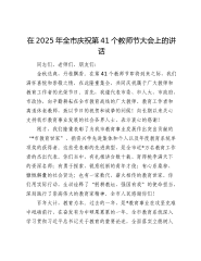 XX医院庆祝2025年教师节大会讲话稿尊敬的各位老师、各位同仁,亲爱的同学们:大家下午好!金秋九月,丹桂飘香。在这个充满收获与希望的美好季节,我们欢聚一堂,共同庆祝中华人民共和国第41个教师节。今年的教师节,具有承前启后、继往开来的特殊意义,全国上下正以“大力弘扬教育家精神,加快建设教育强国”为主题,掀起尊师重教的新热潮。在此,我谨代表医院党委和领导班子,向辛勤耕耘在教学、医疗、科研一线的全体教师和教育工作者,向为医院发展奉献了毕生心血的离退休老教师、老同志,致以最崇高的敬意和最诚挚的节日问候!向所有关心支持我院教育事业发展的同仁们、同学们,表示最衷心的感谢!过去的一年,是医院在高质量发展道路...