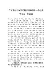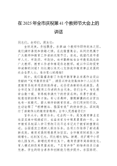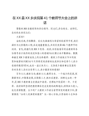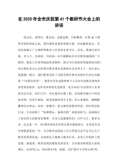 在庆祝第41个教师节暨优秀教师表彰大会上的讲话同志们,老师们:金秋九月,丹桂飘香。在这个满载收获与希望的美好时节,我们满怀喜悦与崇敬,共同迎来了中华人民共和国第41个教师节。今天,我们在此隆重集会,旨在表彰为XX教育事业发展作出卓越贡献的先进集体与个人,共同庆祝属于全体教育工作者的光荣节日。在此,我谨代表XX党委、XX政府,向辛勤耕耘在全市(区/县)教育战线上的广大教师、教育工作者和离退休老教师,致以节日的祝贺和诚挚的问候!向今天受到表彰的优秀教师和先进教育工作者,表示热烈的祝贺和崇高的敬意!向长期以来关心支持XX教育事业发展的社会各界人士,表示衷心的感谢!一、回顾过去,教育事业在砥砺奋进中谱...