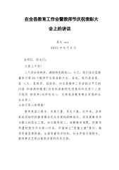 在全县教育工作会暨教师节庆祝表彰大会上的讲话县长xxx2023年9月8日老师们、同志们:大家上午好!三尺讲台育桃李,满腔热忱践初心。今天,我们在这里隆重举行第39个教师节庆祝表彰大会。首先,我代表县委、县人大、县政府、县政协,向全县教育工作者致以节日的问候和崇高的敬意!向受到表彰的先进集体和先进个人表示热烈的祝贺!向所有关心、支持我县教育事业发展的社会各界人士表示衷心的感谢!教育是国之根本、发展之重、民生之基。近年来,县委县政府始终把教育摆在优先发展的战略地位,把发展教育作为最大的民生工程,加大教育投入,破解教育难题,把教学质量的提升作为核心任务,牢固树立"质量立教"意识,教学质量显著提高,生...