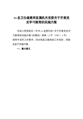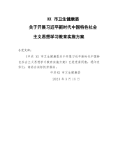 XX市卫生健康委关于开展习近平新时代中国特色社会主义思想学习教育实施方案各党支部:《中共XX市卫生健康委关于开展习近平新时代中国特色社会主义思想学习教育实施方案》已经党委同意,现印发你们,请结合实际抓好落实。中共XX市卫生健康委2023年3月15日中共XX市卫生健康委会关于开展习近平新时代中国特色社会主义思想学习教育实施方案为深入贯彻落实《中共XX市委印发的通知》精神(X字〔2023〕12号),按照中省市工作要求,结合我县卫生健康系统工作实际,现制定如下实施方案。一、重大意义党的十八大以来,以习近平同志为核心的党中央勇于推进实践基础上的理论创新,全面系统回答了新时代坚持和发展什么样的中国特色社...