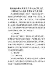 某街道办事处开展党员干部和公职人员涉酒违纪违法问题专项整治工作方案为全面贯彻落实党的十九大和十九届历次全会精神,按照十九届中央纪委六次全会、省纪委XX届二次全会、市第XX次党代会、市委XX届XX次全会、XX届市纪委XX全会部署要求,不断巩固拓展落实中央八项规定精神成果,以优良作风推进我县高质量发展。经研究,决定从3月起,在全县范围内开展党员干部和公职人员涉酒违纪违法问题专项整治。现将工作方案制定如下。一、总体要求坚持以习近平新时代中国特色社会主义思想为指导,坚持发扬钉钉子精神加强作风建设,严肃查处党员干部和公职人员涉酒违纪违法问题,建立健全常态化工作机制,培育优良的党员干部作风,一体推进“三不...