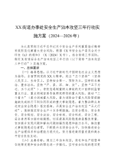 XX街道办事处安全生产治本攻坚三年行动实施方案(2024—2026年)为认真贯彻习近平总书记关于安全生产系列重要指示精神有效防范化解重大安全风险,根据《X市安全生产委员会关于印发《x》的通知》(X〔2024〕X号),结合街道工作实际,制定X街道安全生产治本攻坚三年行动(以下简称“治本攻坚三年行动”)实施方案。一、总体要求(一)指导思想。以习近平新时代中国特色社会主义思想为指导,全面贯彻党的XX大精神,突出“五个坚持”(坚持人民至上、生命至上,坚持安全第一、预防为主,坚持标本兼治、重在治本,坚持“严、紧、深、细、实”,坚持“五不为过、五个必须”),将防范遏制重特大事故的关口前移到监管重点行业、重...