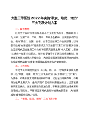 大型三甲医院2022年实施“举旗、培优、增力”三大飞跃计划方案一、指导思想以习近平新时代中国特色社会主义思想为指引,贯彻D的十九大和十九届二中、三中、四中、五中全会精神,全面落实省市全会、省市“两会”、全国、全省、全市卫生健康工作会议部署,以市委市政府“创新提能年”建设要求及市卫健委“三重工作”部署为引领,立足新时代卫生健康工作方针和医院高质量发展“十大工程”,坚持“三满意一发展”办院思路,坚持D委领导下的医院管理新机制,坚持改革发展与成果共享相结合,为建设全面体现新发展理念的城市、实现新时代成都“三步走”发展战略提供坚实的健康保障。二、工作目标立足于公立医院公益性,以“高、精、尖、优”高质量...