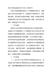 2023年度县直机关学习计划(3384字)2023年是贯彻落实党的二十大精神的开局之年,是落实好“三抓三促”的关键一年,加强党员干部理论学习、强化理论武装、提升能力本领至关重要。根据《环县机关事务管理局开展“三抓三促”行动实施方案》精神,结合年度工作安排,特制定如下学习计划。一、学习目标坚持以习近平新时代中国特色社会主义思想为指导,全面深入学习贯彻党的二十大精神和习近平总书记关于机关事务工作的重要指示精神,以开展“抓学习促提升抓执行促落实抓效能促发展”行动为载体,以“五学联动”为重点,在常学常新中加强理论修养,在真学真信中坚定理想信念在学思践悟中牢记初心使命,在细照笃行中不断修炼自我在知行合一...