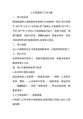 集团审计监察部人力资源审计工作方案一、审计的目的根据集团审计监察部的年度审计计划和统一安排,审计部将于20xx年3月11日开始,对xx集团人力资源部20xx年1月至20xx年1月的人力资源规划与设计、制度与流程、招聘与配置、培训与开发、薪酬与福利、考核与评价、劳动关系管理等进行检查和评价,发表审计意见。二、审计范围以人力资源部为主,涉及到集团财务部、行政部等相关部门。三、审计方法采用询问相关责任人、审核关键控制文档、收集分析相关数据等审计方法。四、审计主要内容及审计程序1.此次审计思路与路径组织架构及人员设置——制度及流程——招聘、人员晋升、录用、离职——人员培训与开发——绩效考核、岗位评价—...