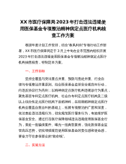 XX市医疗保障局2023年打击违法违规使用医保基金专项整治精神病定点医疗机构核查工作方案根据年度计划工作安排,结合“春风利剑”专项行动工作部署,XX市医疗保障局定于3月上中旬在全市范围内组织开展2023年打击违法违规使用医保基金专项整治精神病定点医疗机构抽查核查,特制定本方案。一、工作目标坚持全覆盖与突出重点并重、预防与查处并重、行业自律与专项整治并重原则。结合医保基金监管安全规范年行动,向违反协议行为亮剑;以精神病定点医疗机构违规诊疗为重点,聚焦基层专科定点医疗机构、社会办专科定点医疗机构及二级以上综合性定点医疗机构下设精神科,在前期精神病定点医疗机构全覆盖自查自纠的基础上,拓展专项整治的广...