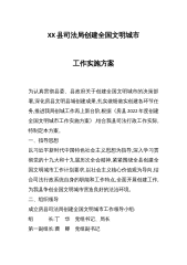 XX县司法局创建全国文明城市工作实施方案为认真贯彻县委、县政府关于创建全国文明城市的决策部署,深化房县文明县城创建成果,扎实做细做实创建各环节任务,推进我局创城工作再上新台阶,根据《房县2022年度创建全国文明城市工作实施方案》,结合我县司法行政工作实际,特制定本方案。一、指导思想以习近平新时代中国特色社会主义思想为指导,深入学习贯彻党的十九大和十九届历次全会精神,紧紧围绕全县创建全国文明城市工作计划要求,以社会主义核心价值观为导向,结合司法行政系统自身的职能和工作特点,全面开展创建工作,为我县争创全国文明城市营造良好的法治环境。二、组织领导成立房县司法局创建全国文明城市工作领导小组:组 ...