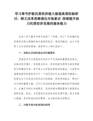 学习奉节护航民营经济做大做强典型经验研讨:树立改革思维强化市场意识持续提升助力民营经济发展的服务能力在深入学习重庆市奉节县按下“快帮、快办”快进键护航民营经济做大做强的相关典型经验后,我深受触动,也从中获得了许多宝贵的感悟。现将学习心得交流如下。一、深刻认识到民营经济的重要性民营经济作为我国经济体系中不可或缺的重要组成部分,在推动经济增长、创造就业机会、促进创新发展等方面发挥着举足轻重的作用。奉节县大力护航民营经济的做法,让我更加清晰地看到民营经济对于一个地区经济社会发展的关键意义。民营企业不仅是地方经济活力的源泉,更是吸纳就业、带动产业升级的重要力量。它们以灵活的经营机制和敏锐的市场洞察力,...
