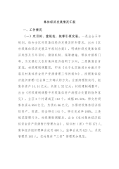 集体经济发展情况汇报一、工作情况(一)定目标、重规范,统筹引领发展。一是出台五年规划。结合全区村级集体经济发展实际和需求,出台《区村级集体经济发展五年规划方案》,明确村级发展集体经济类型及五年目标、激励机制、保障措施、帮扶对接部门等,为发展壮大农村集体经济指明了方向。二是摸清自身家底。村级建制调整前,印发《关于扎实推进乡村振兴开展农村集体资金资产资源清理工作的通知》,按照集体经济组织清理+社会第三方确认的方式,全面清理核实村、组集体资产14.14亿元,负债1.32亿元;村级建制调整中,出台《村级建制调整中村级集体资产清理与处置的指导意见》,全区X个村调减至112个,减幅49.55%,移交村级集...