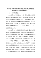 近年来,XX镇始终把发展壮大村级集体经济作为新时期农村工作和农村基层组织建设的一项重要任务,坚持以农村集体资产、资源、资金等要素有效利用为纽带,因地制宜探索各种村级集体经济实现形式,不断发展壮大村级集体经济实力,进一步健全村级集体经济管理机制、经营机制、监督机制,调动村集体成员积极性,增强村级自我发展、自我服务、自我管理能力。现将具体工作汇报如下:一、总体情况XX镇为XX县县委政府所在地,是全县政治、经济、文化、交通、信息中心。XX镇辖X个行政村和XX区,总面积X.X平方公里,耕地面积X亩,总人口X.X万人,其中常住人口X.X万人,乡村人口X.X万人。全镇各村集体经济收入均超过X万元,周田村、...