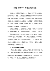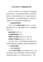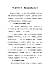 XX县20XX年一季度经济运行分析今年以来,自治县县委、自治县人民政府深入学习和全面贯彻落实中央和自治区、市会议精神及各项决策部署,主动适应经济发展新常态,坚持以富民强县统揽工作全局,保持稳中求快总基调,采取各项有效措施,力促县域经济保持稳定发展。但因渔业和工业大幅度减产,全县一季度经济运行较去年同期有所下降.一、全县经济运行基本情况20XX年一季度,全县地区生产总值同比下降X.X%;分产业看,第一产业同比下降X.X%;第二产业同比下降X.X%;第三产业同比增长X.X%。固定资产投资同比下降X.X%;社会消费品零售总额增长X.X%;城镇居民人均可支配收入完成XXXX元,增长X.X%;农村居民人...