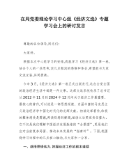 在局党委理论学习中心组《经济文选》专题学习会上的研讨发言尊敬的各位领导,同志们:大家好。根据本次中心组学习的安排,我就学习《经济文选》第一卷,结合个人的一些思考,谈几点粗浅的感悟和体会,希望能与大家交流互鉴,共同提高。今年3月,《经济文选》第一卷正式出版发行,这在全党全国的政治经济生活中都是一件大事。这部文选系统收录了总书记从2012年11月到2024年12月间关于经济工作最重要、最核心的著作,可以说是一部思想深邃、内涵丰富的马克思主义政治经济学中国化时代化的光辉文献。初读这部著作,给我的整体感受是震撼,再读则感到解渴,细读之后更觉责任重大。它不仅是我们理解中国经济发展脉络的“全景图”,更是我...
