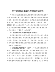 关于党建与业务融合发展情况的报告今年以来,我行党委坚持以高质量党建引领高质量发展为根本遵循,深入探索党建工作与业务经营深度融合的有效路径,将党的政治优势、组织优势转化为发展优势、竞争优势,通过强化联建共建机制,实现了党建工作与业务发展的同频共振、互促共进。截至2025年8月末,在党建引领下,全行各项存款余额较年初增长3.7亿元,各项贷款余额较年初增长4.3亿元,融合成果显著,为服务地方经济发展注入了强劲的“红色动能”。一、抓党建促共建,筑牢融合发展“压舱石”我行党委深刻认识到,银行作为服务地方经济的金融主力军,必须跳出“就党建抓党建”的传统思维,将党建工作融入业务发展的全过程、各环节。为此,我...