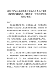 县委书记在全县高质量发展动员大会上的讲话(投资和项目建设、招商引资、营商环境暨民营经济发展)同志们:这次会议是我们召开的一次高规格的会议,也是聚焦高质量发展的一次动员大会,核心是落实项目建设、招商引资、营商环境和民营经济发展这四项工作。之所以合并起来集中部署,一方面是为了减少会议,另一方面这四项工作本来就是一体的。xx高质量发展关键在项目建设、核心在招商引资、基础在营商环境、动力在民营经济,这是xx高质量发展四个“擎天大柱”。所以,这次动员会议是落实中央、省市委经济工作会议精神的安排部署会,也是落实“八个行动”的一次再动员、再部署、再细化会议,就是为了能够早安排、早部署、早动手,从而实现各项工...