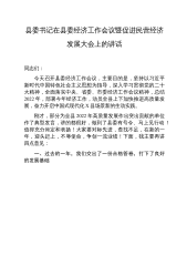县委书记在县委经济工作会议暨促进民营经济发展大会上的讲话同志们:今天召开县委经济工作会议,主要目的是,坚持以习近平新时代中国特色社会主义思想为指导,深入学习贯彻党的二十大精神,全面落实中央、省委、市委经济工作会议精神,总结2022年,部署今年经济工作,动员全县上下加快推进高质量发展,奋力开启中国式现代化X县场景新的生动实践。刚才,部分为全县2022年高质量发展作出突出贡献的单位作了典型发言,讲的都很好,做到了县委有号令、马上见行动!值得充分肯定和表扬!大家要对标先进,查找不足,在新的一年,迎头赶上,不辱使命,争创一流业绩!下面,我主要再讲四点意见:一、过去的一年,我们交出了一份合格答卷,打下了...